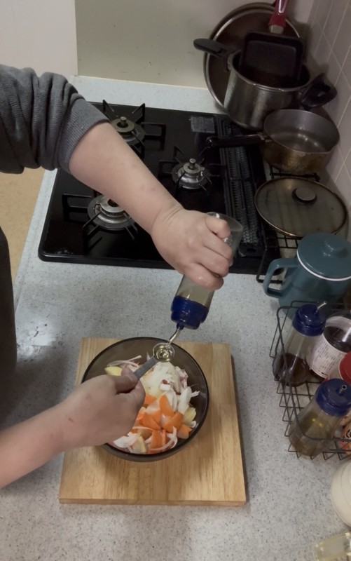 専用の電子レンジ調理鍋に材料をいれ、小さじ2サラダ油をいれます。