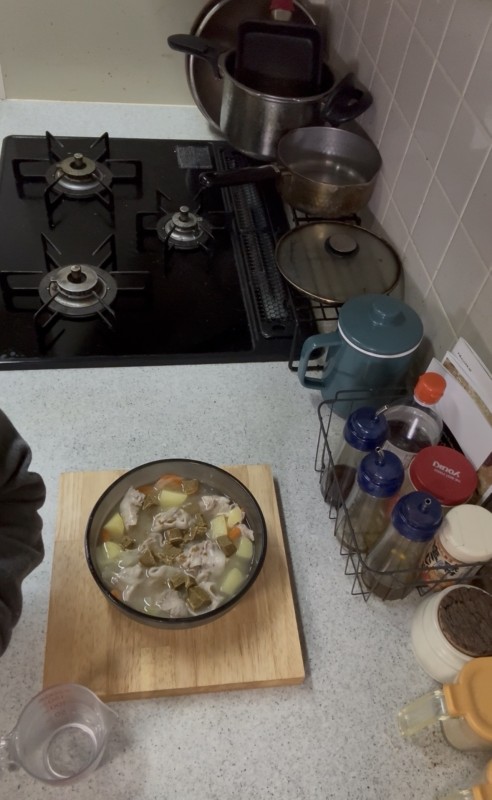 そして600wで8分レンチンし、一度調理鍋を出し、水200mlと刻んだカレーるうをふたかけ入れます。