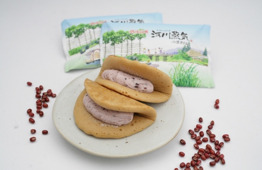こちらは定番の小豆クリーム。幅広い世代に好まれる味に仕上げるために、黒糖風味の蒸したカステラ風生地に独自の小豆クリームを優しく包み込んだ、洋風の蒸しどら焼きです。なかなか手に入らない「幻の黒糖」と国内最高のつぶあんに適した「国内産小豆」を贅沢に使用しています。